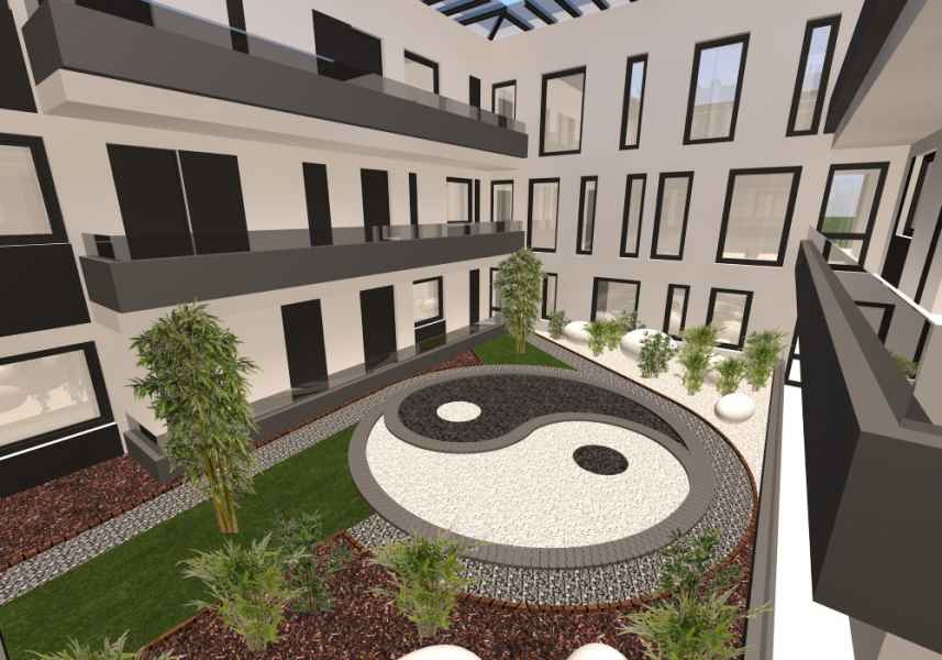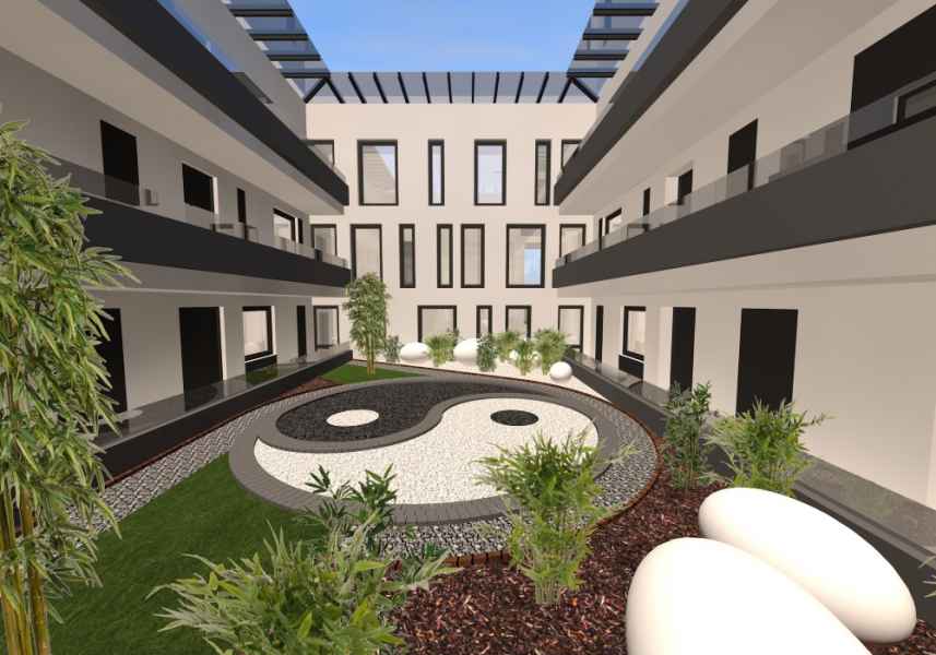 Az egyedi megjelenésű épület és a zárt udvari harmónia egy biztonságos élet érzetet adva modern letisztult formában jelenik meg .